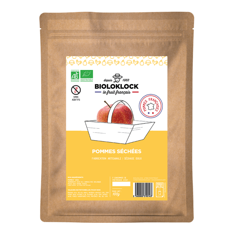 Nos Pommes Juliet séchées BIO, au goût unique, sont conditionnées dans un sachet pasteurisé de 125 grammes. Elles sont 100% françaises.