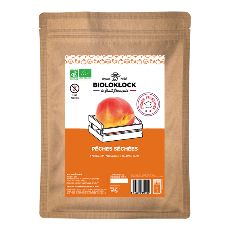 Nos pêches séchées dénoyautées BIO, en-cas sain au goût savoureux, sont conditionnées dans un sachet pasteurisé de 125 grammes. Elles sont 100% françaises.