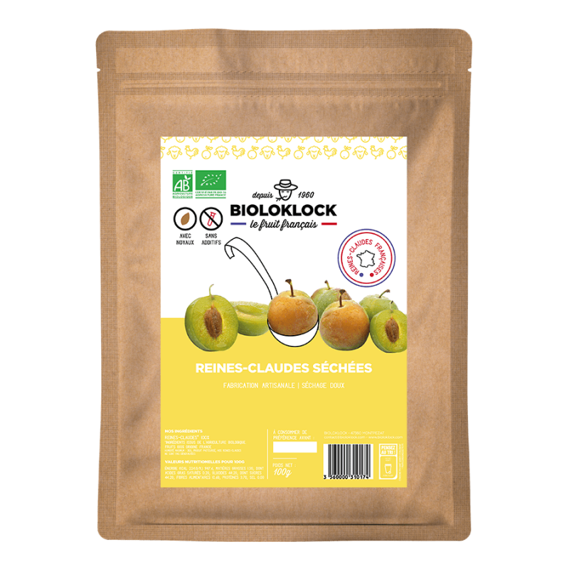 Nos prunes Reine Claude séchées BIO, au goût unique, sont conditionnées dans un sachet pasteurisé de 250 grammes. Ils sont 100% françaises.