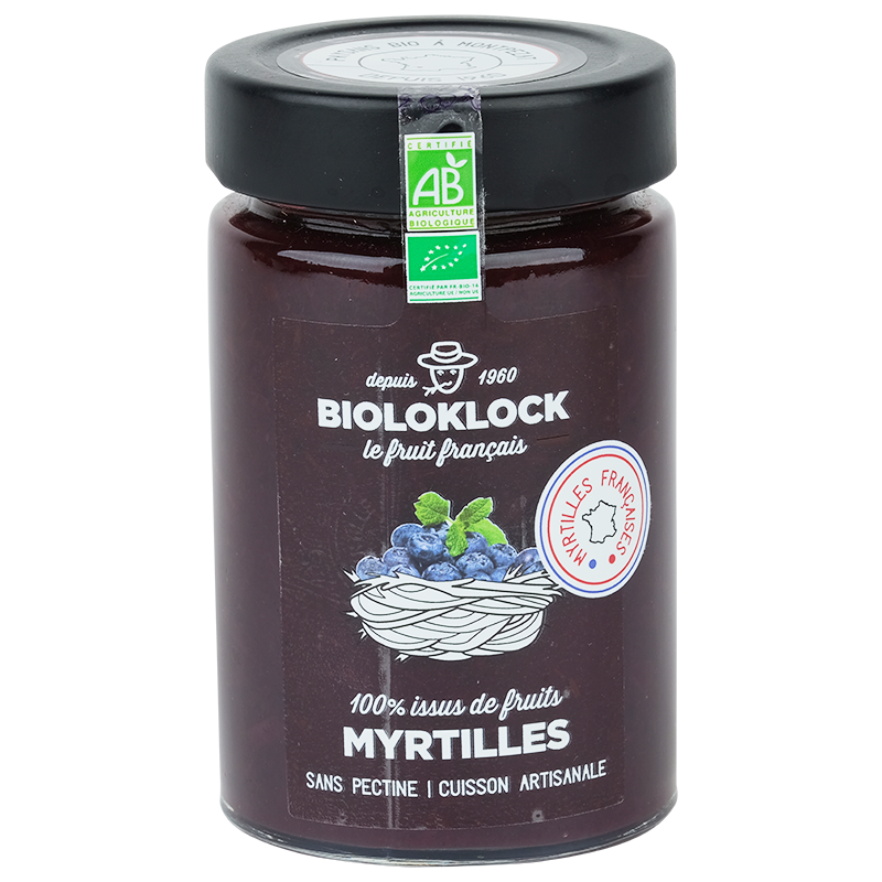 Ce 100% issus de fruits à la myrtille BIO, particulièrement parfumée, est conditionnée dans un joli bocal en verre recyclable de 210g.