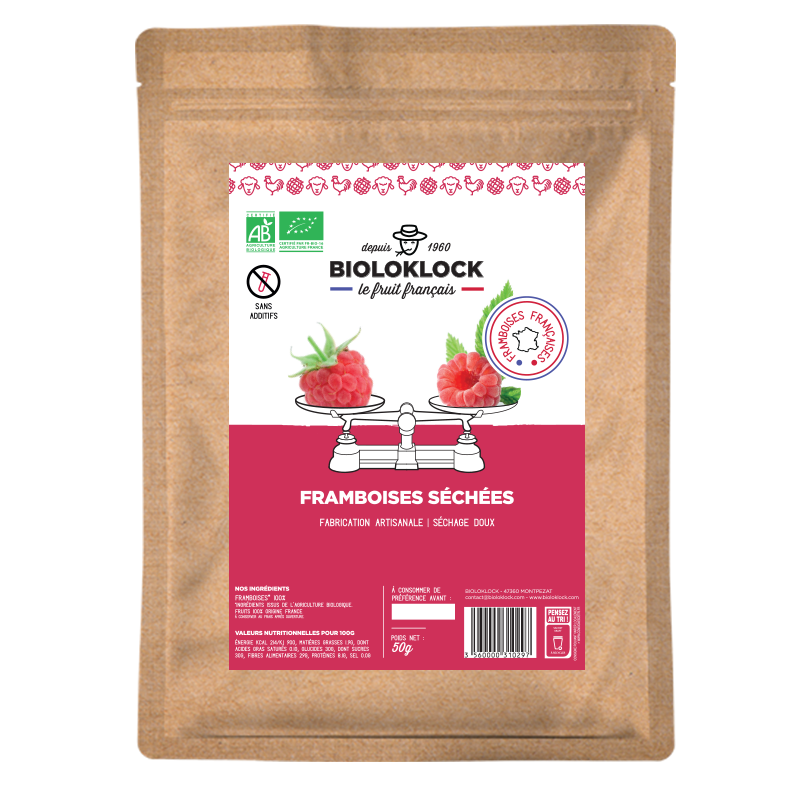 Les framboises sont conditionnées dans des sachets de 50g avec un zip. Vous pouvez donc les glisser facilement dans votre sac pour un encas ou après une séance de sport.